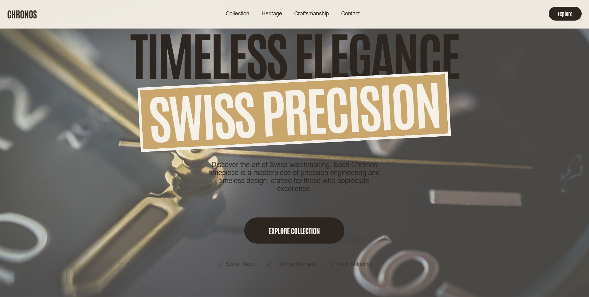 Chronos Luxury Timepieces is a premium React-based marketing website for Swiss luxury watches, featuring smooth GSAP animations, elegant product showcases, craftsmanship videos, testimonials, and a responsive Tailwind CSS design optimized for performance.